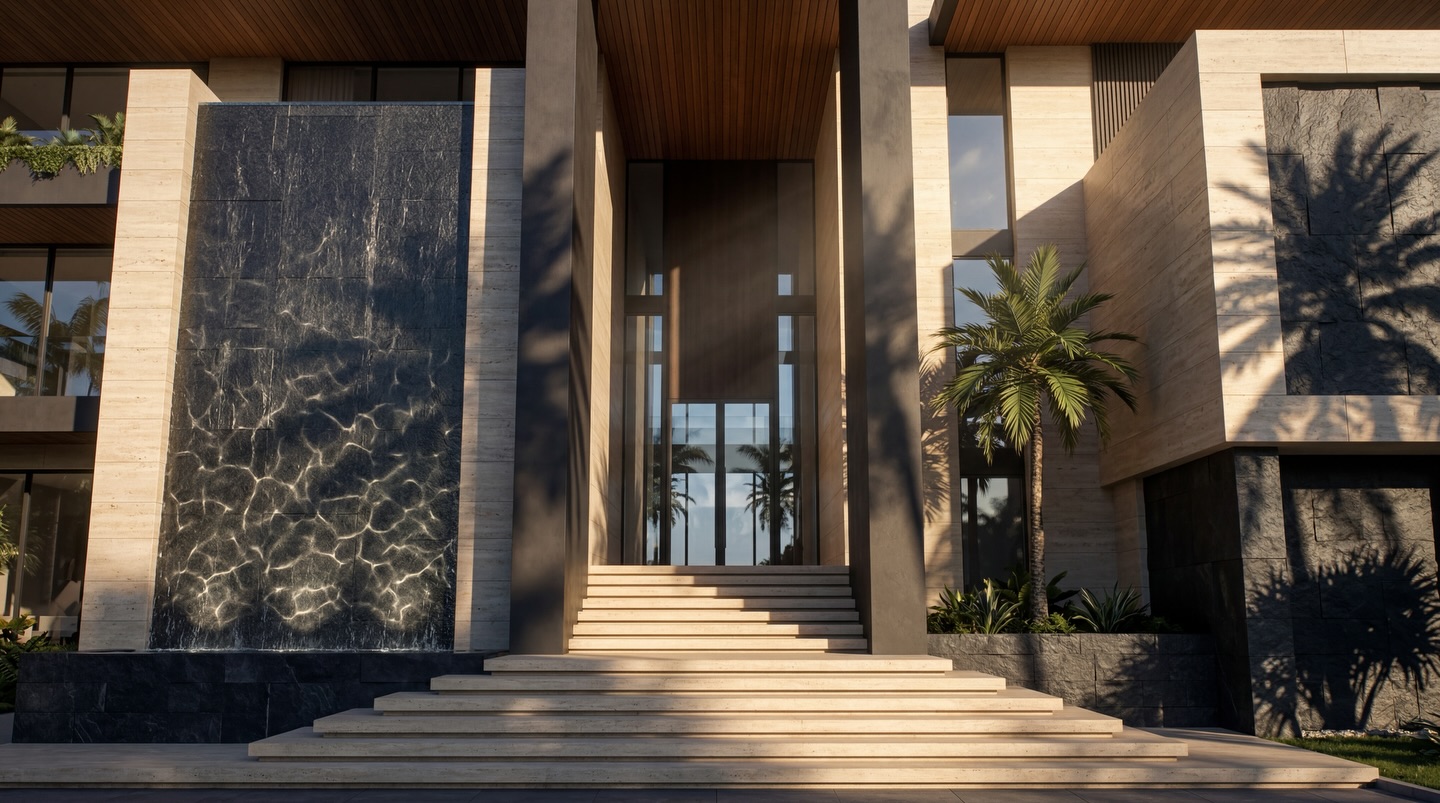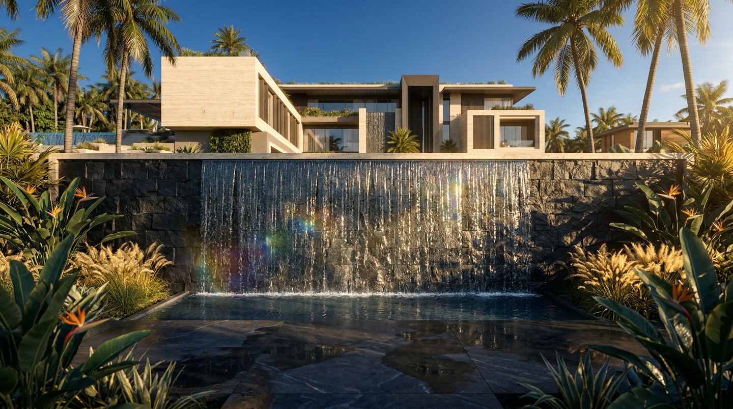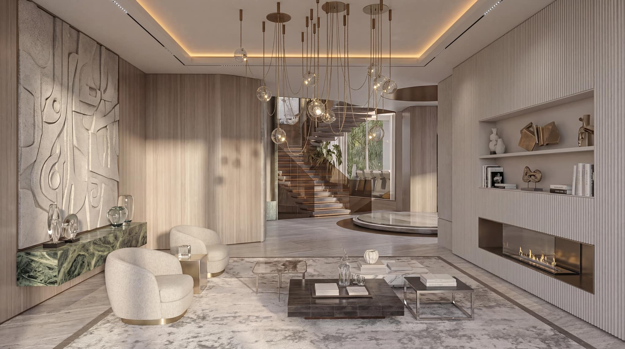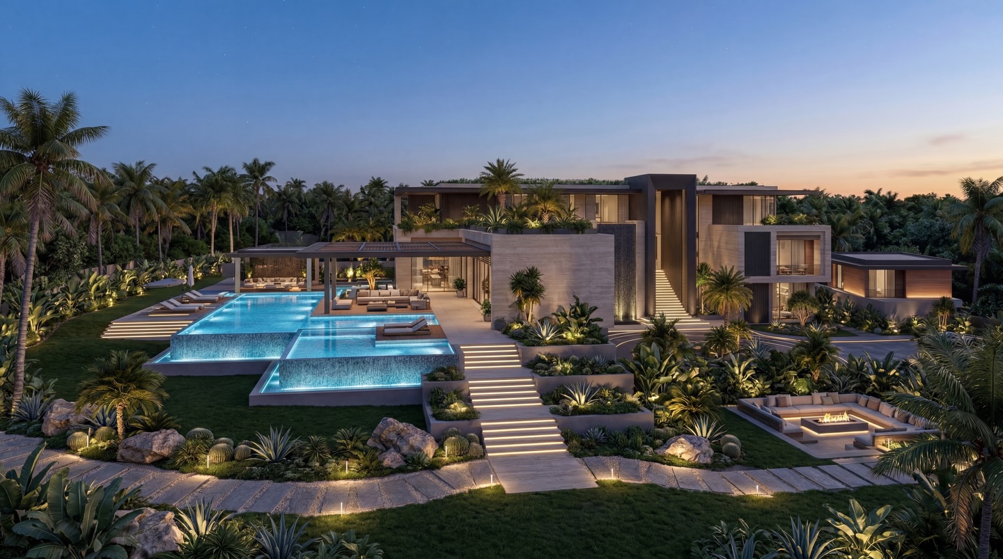 The interior experience is one of refined opulence, characterized by double-height volumes, sculptural staircases, and a palette of rare stones and warm metallics. Outside, the estate unfolds into a multi-sensory landscape featuring cascading infinity pools, tiered garden terraces, and immersive water features. Every element, from the textured feature walls to the custom lighting installations, is crafted to provide a serene sanctuary that balances grand-scale entertaining with intimate private living.